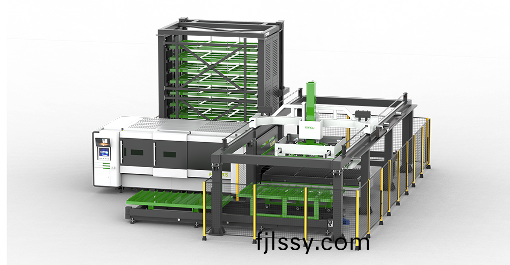 在鬆穀激光切割機的切割(ge)平檯上搭載 HyStore 係列自動上下料及倉儲係統,通過輭件控(kong)製係統(tong)進行串聯控製,實現無人(ren)值守的全自動化智能激光切割生産線;